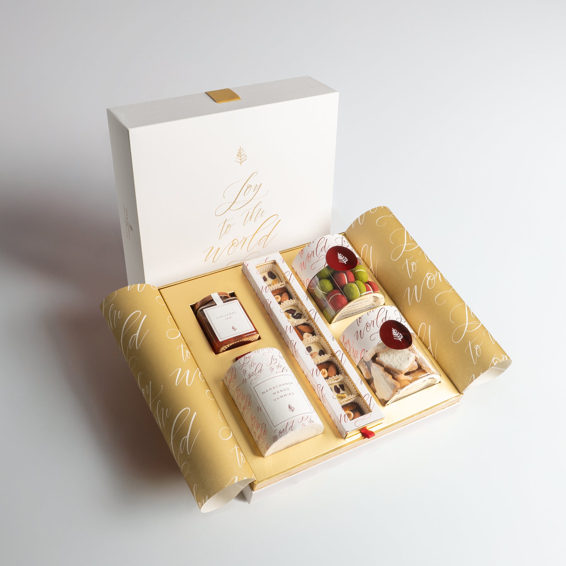 A selection of Christmas jam or Wildflower Honey, Festive Gummies or Winter Whisper tea, 2 boxes of cookies, 1 box of White & Dark chocolate 8pcs